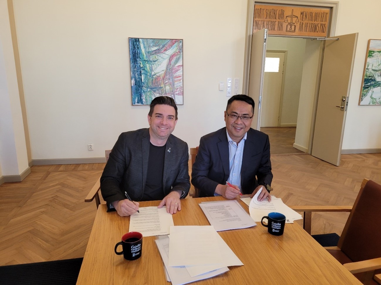 2022年3月22日,,,,,,bifa必发材质欧洲子公司 Senior Material Properties AB和瑞典埃尔斯基斯蒂娜市市长,,,,,,在埃尔斯基斯蒂娜市政厅市长办公室签署了bifa必发材质欧洲项目二期土地购置条约,,,,,,条约涉及12万平方米土地,,,,,,用于建设欧洲bifa必发二期下一代湿法基膜主线以及配套涂覆项目。。。。。这是bifa必发材质在欧洲市场迈出的又一大步!